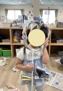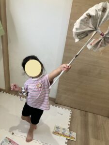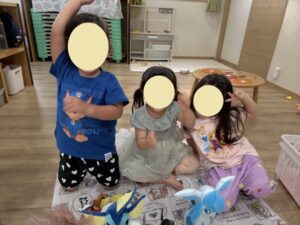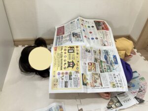 まずは新聞遊び!お布団にしてみたり、ハートのステッキを作ってみたりとそれぞれ違う楽しみ方をしていたくま組さん![]()